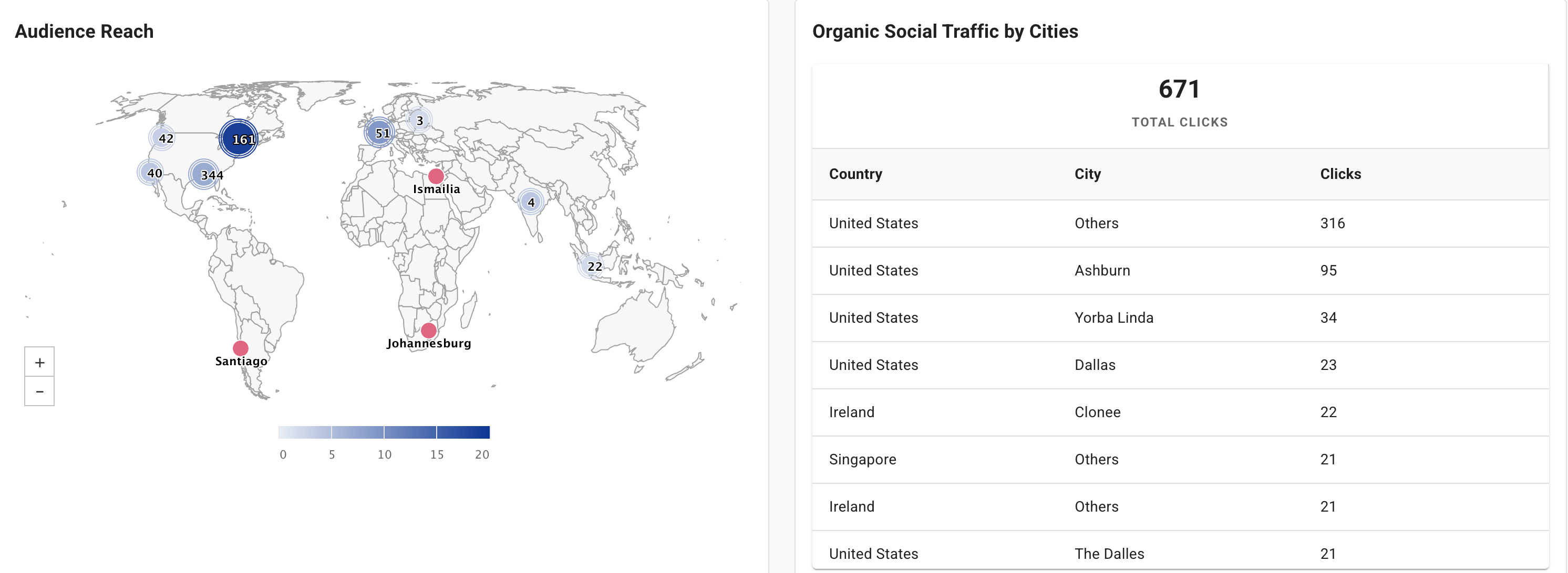 Audience Reach Map – A world map highlights where your audience is located. Darker regions indicate higher reach. A companion table lists the top cities by organic traffic, allowing you to tailor content to key markets. The map can be drilled down to see audiences in individual cities.